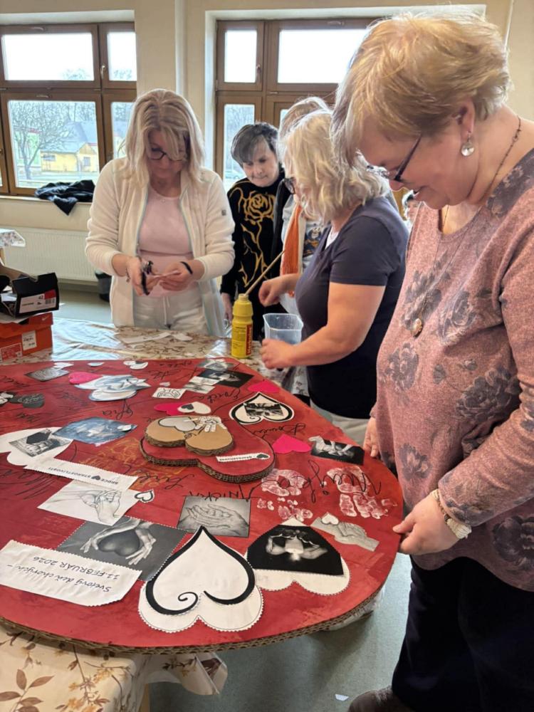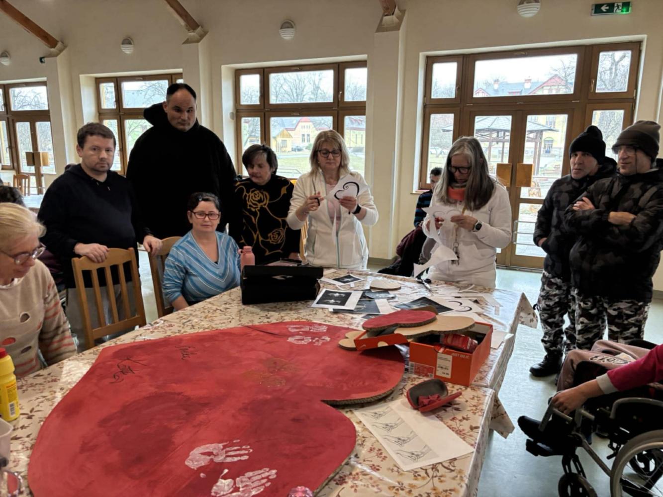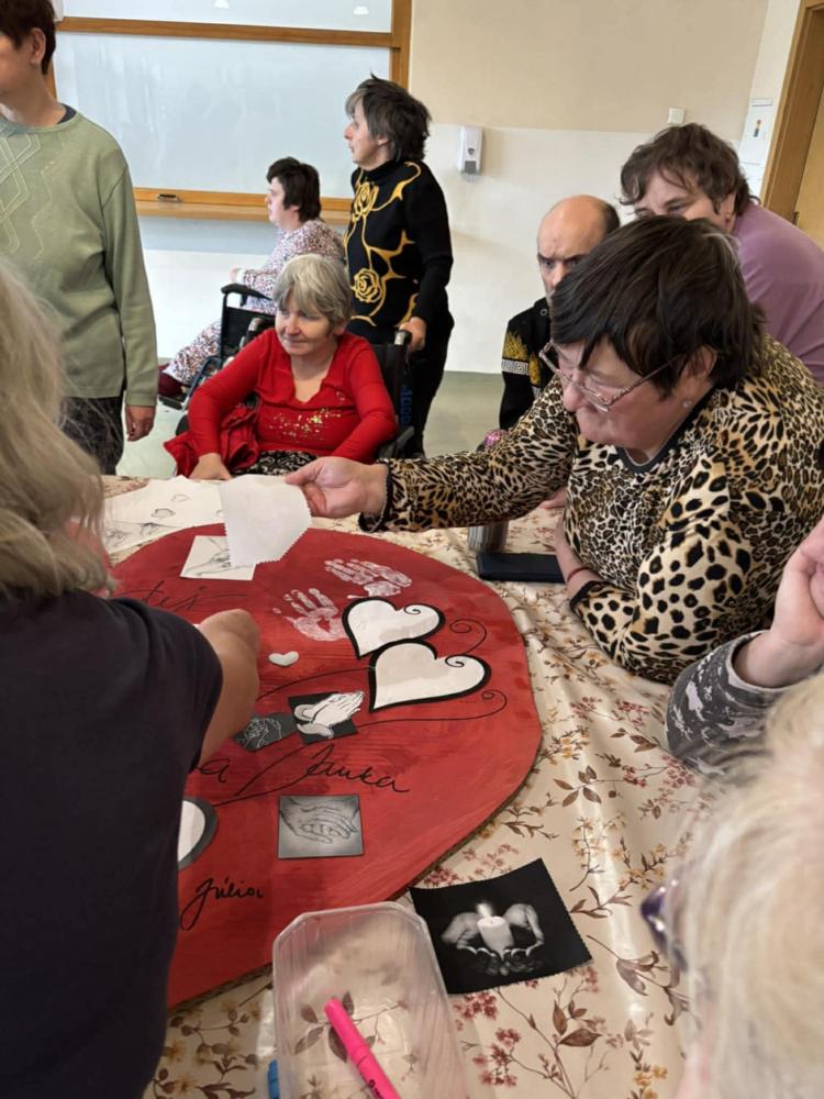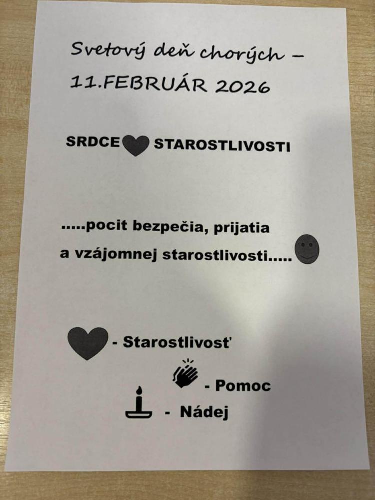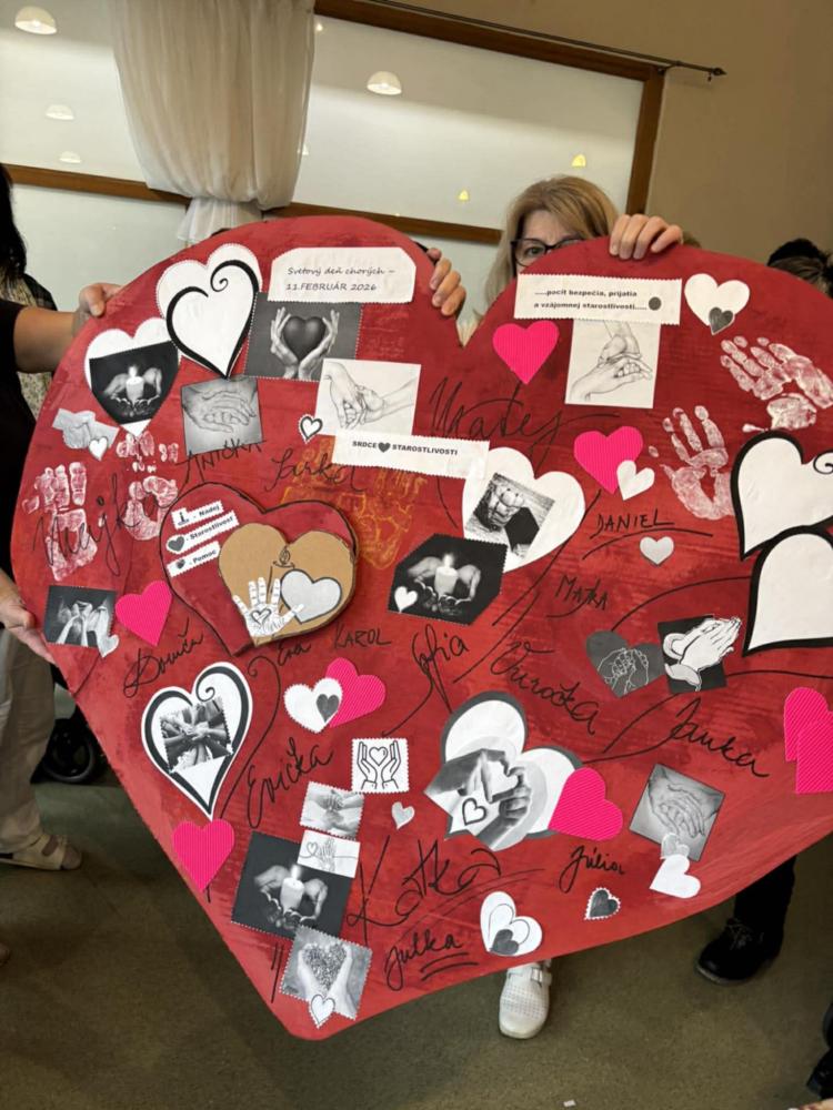 Pri príležitosti Svetového dňa chorých pripomenuli hodnotu zdravia, vzájomnej blízkosti a starostlivosti. "Cieľom aktivity" bolo podporiť pocit bezpečia, prijatia a vzájomnej starostlivosti medzi nami všetkými. Spoločne sme si jednoduchými slovami povedali, že dnes myslíme na ľudí, ktorí sú chorí, aj na tých, ktorí sa o nich s láskou starajú. V tvorivej časti prijímatelia lepili papierové srdcia, do ktorých vkladali symboly rúk (pomoc), srdca (starostlivosť) a svetla (nádej). Každý pridal kúsok seba – svoje meno, dotyk, myšlienku. Výsledkom je veľké spoločné srdce, ktoré je krásnym symbolom spolupatričnosti a dobra medzi nami Ďakujeme všetkým - spoločne sme vytvorili niečo, čo má skutočný význam.